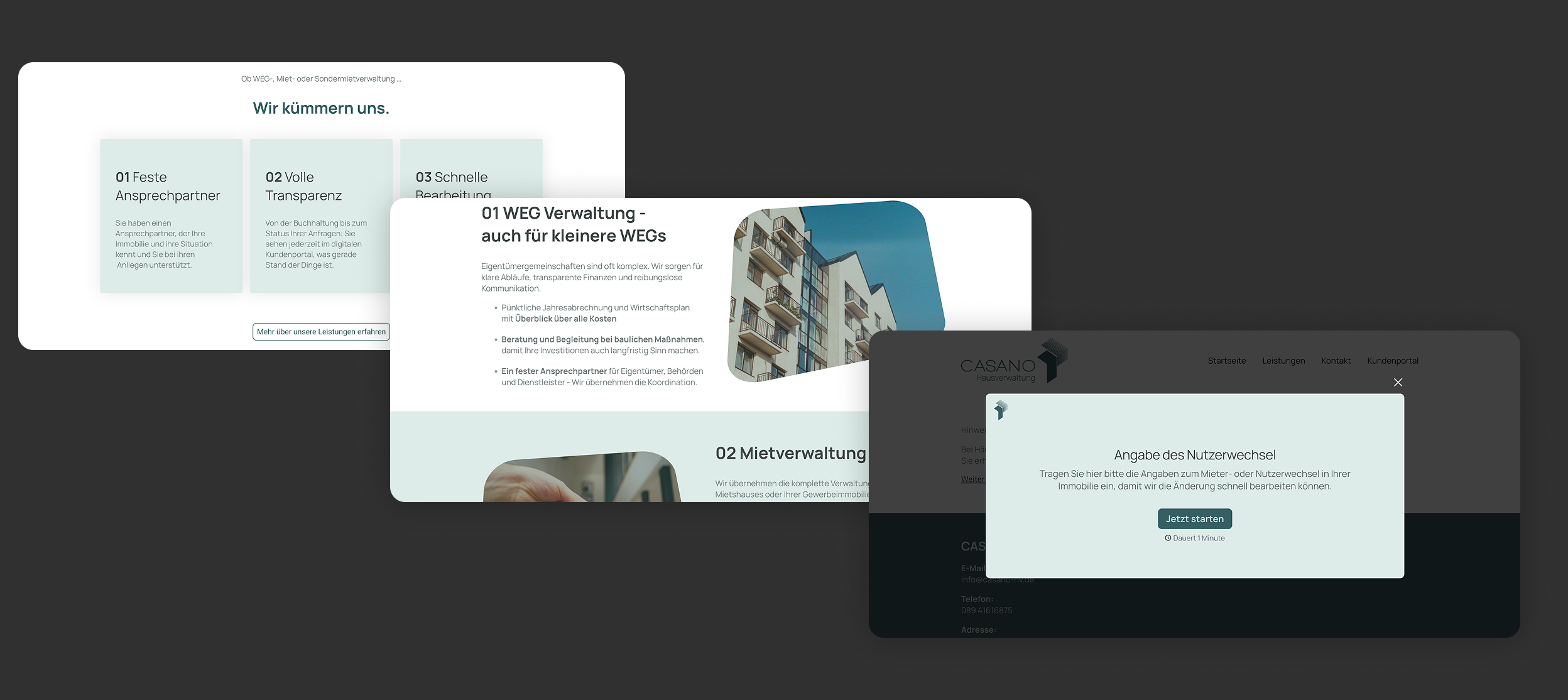 Für die CASANO Hausverwaltung wurde ein ganzheitliches Marken- und Digitalisierungskonzept entwickelt, das strategisches Design mit funktionaler Effizienz verbindet. Vom Aufbau einer eigenständigen Markenidentität über die Konzeption eines nutzerzentrierten Webauftritts bis hin zur Gestaltung hochwertiger Brand Assets entstand ein konsistentes Gesamtbild mit klarer Haltung.